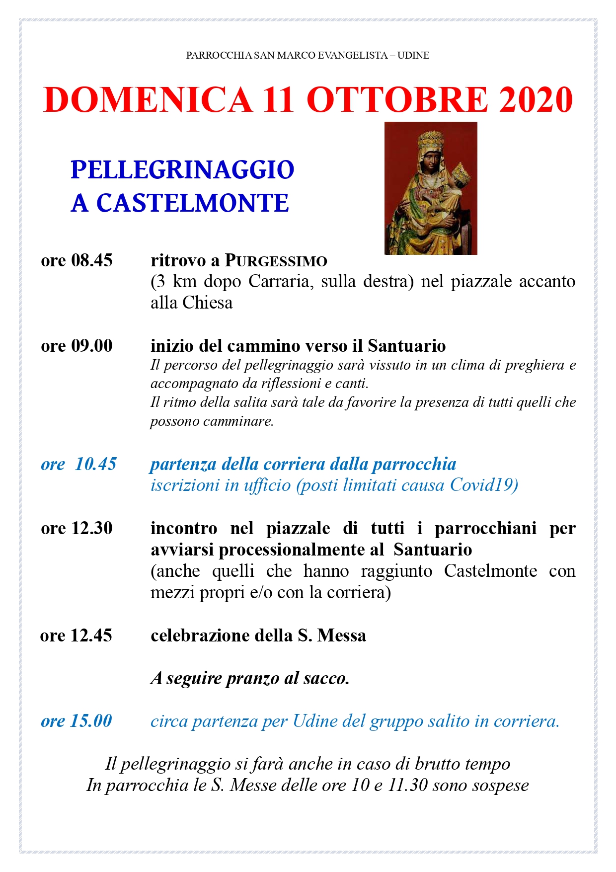 Il pellegrinaggio a Castelmonte della nostra parrocchia è fissato per domenica 11 ottobre con S. Messa alle ore 12.45.