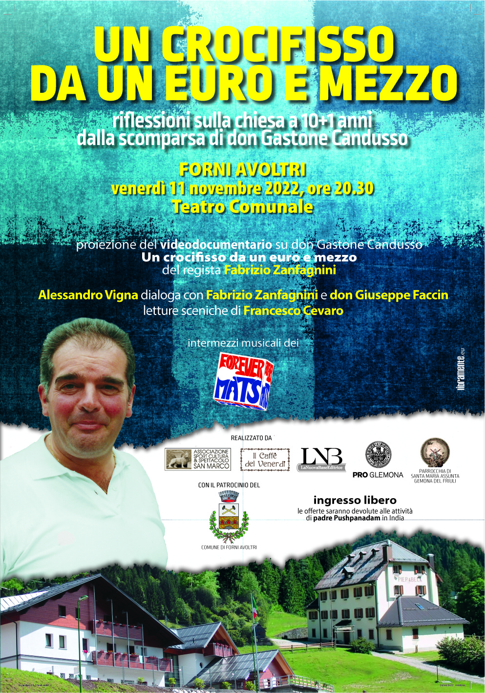 Venerdì 11 novembre alle ore 20.30 al Teatro Comunale di Forni Avoltri, il Caffè del Venerdì presenta la proiezione del videodocumentario su don Gastone Candusso “Un crocifisso da un euro e mezzo” del regista Fabrizio Zanfagnini seguono momenti di riflessione, letture e intervalli musicali.
