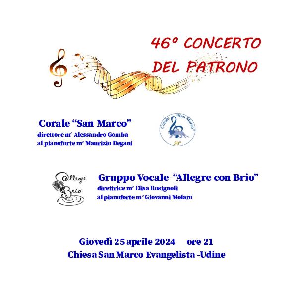 Il 25 aprile alle 21.00 in chiesa, ritorna tradizionale concerto del Patrono con la Corale “San Marco”, nel suo 50° di fondazione, e il coro Allegre con Brio.
