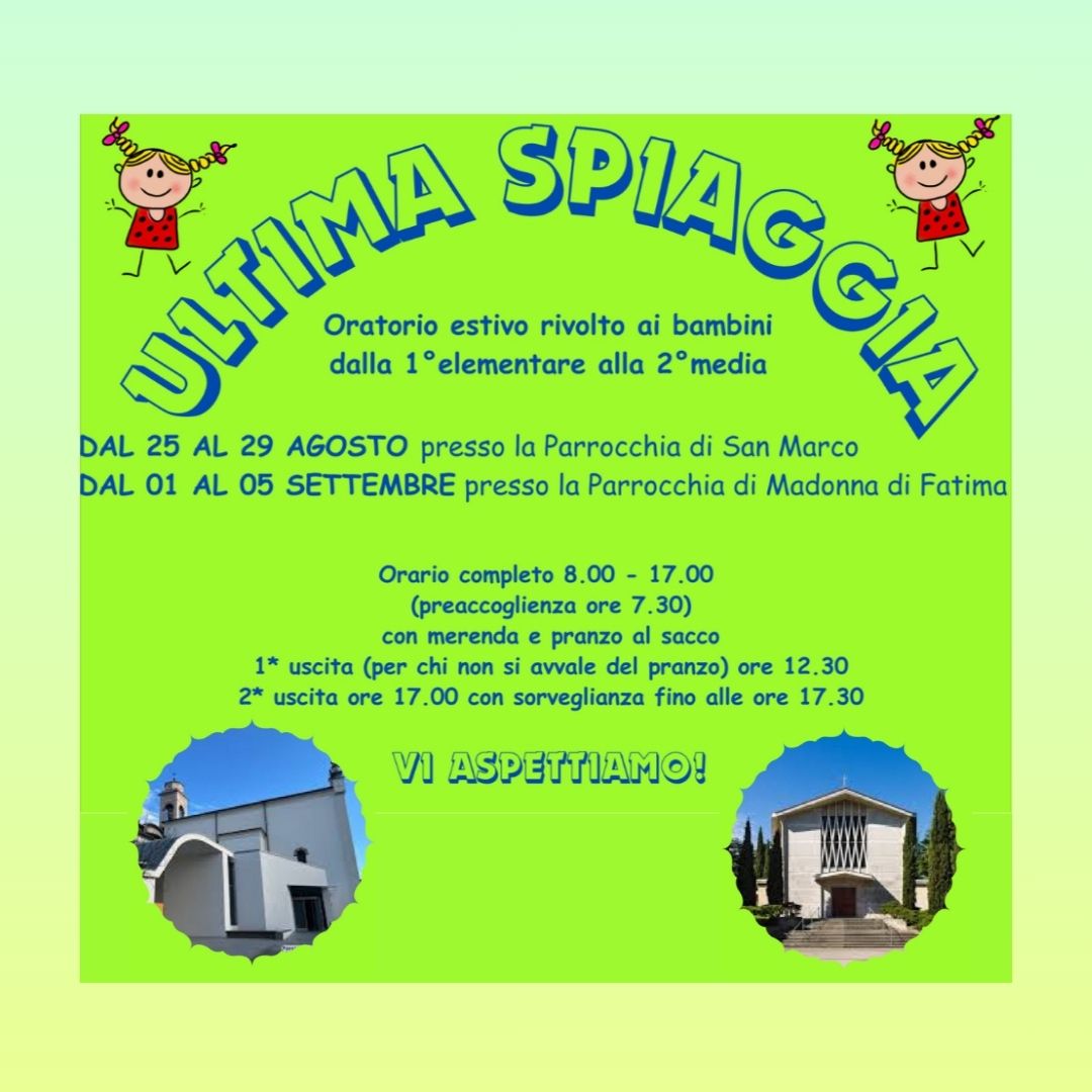 Lunedì 25 agosto inizierà la prima settimana dell’attività denominata “ULTIMA SPIAGGIA” con ritrovo alle ore 8.00 nel cortile della parrocchia di San Marco (dalle 7.30 garantito servizio di pre-accoglienza).